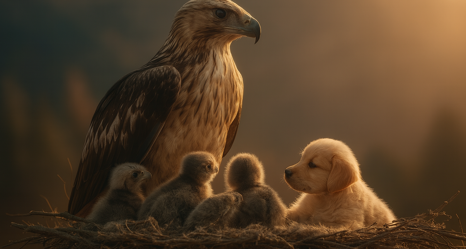 Au début, personne n’osait croire ses yeux. Le chiot n’était ni effrayé ni blessé. Il jouait, oui, jouait, avec trois petits aiglons duveteux. Le chiot remuait la queue et poussait délicatement les oisillons comme s’ils faisaient partie de sa fratrie. La mère aigle se tenait au bord du nid, parfaitement calme. Ni agressive ni méfiante, simplement posée, comme si elle avait accepté le chiot dans sa propre famille.